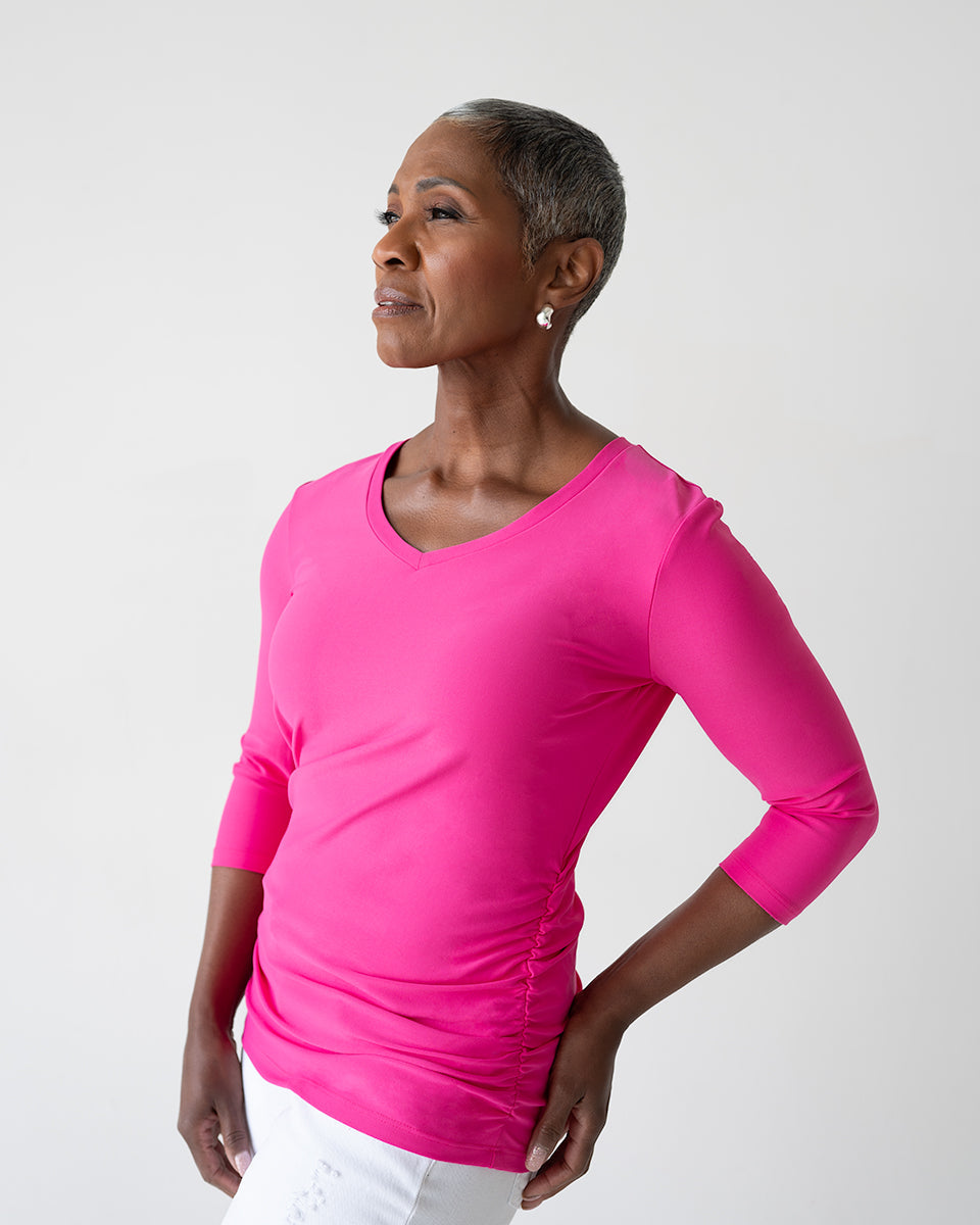 The Rachel is our single-layer top featuring ruched sides, a pretty V-neckline, and a comfortable 3/4 sleeve that covers the elbow for a stylish effect. Ruched sides offer feminine accents that beautifully shape the torso, while the soft V-neckline is complementary and classy. The Rachel top also offers functional fabric, featuring UPF 50 sun protection and moisture-wicking qualities to keep you cool throughout the day.