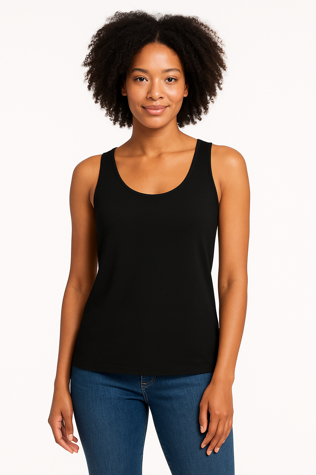 The Claudette Tank Top by JudyP is a bra-friendly essential that effortlessly combines classic style with modern comfort. Featuring a timeless scoop neckline and a flattering fit that gently accentuates your natural curves, Claudette offers a wider cut through the midsection and hips for easy movement without sacrificing shape. The double-front construction smooths your silhouette, giving you a polished, confident look perfect for layering or wearing solo in warmer weather.