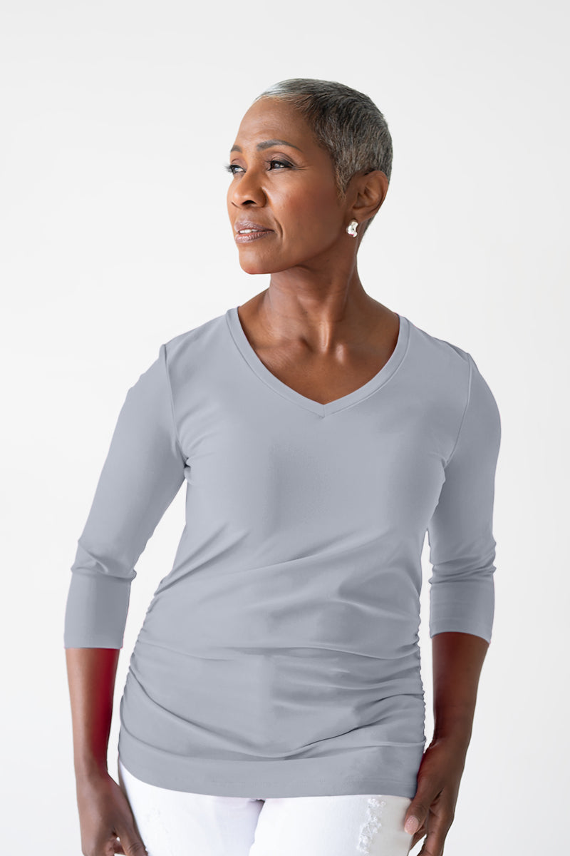 The Rachel is our single-layer top featuring ruched sides, a pretty V-neckline, and a comfortable 3/4 sleeve that covers the elbow for a stylish effect. Ruched sides offer feminine accents that beautifully shape the torso, while the soft V-neckline is complementary and classy. The Rachel top also offers functional fabric, featuring UPF 50 sun protection and moisture-wicking qualities to keep you cool throughout the day.
