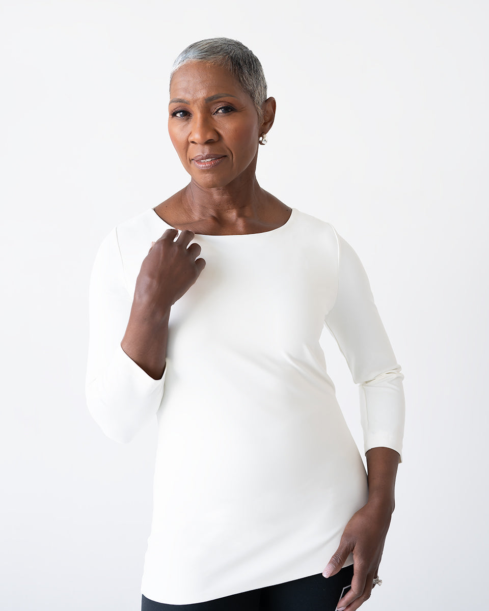 Details: Build a wardrobe you love, starting with our Sabrina top. This is one of our top 5 best sellers for a reason, with bracelet-length sleeves and a classy, flattering boat neck design reminiscent of Aubrey Hepburn's leading ladies. Featuring a double-front construction that stays in place all day while smoothing your silhouette. Ideal for layering or wearing unadorned, and available in 14 designer colors.