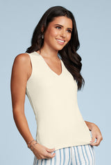 Effortlessly stylish and endlessly versatile, the Tracey Top is your wardrobe's new best friend. Its sleeveless cut and flattering V-neckline make it the perfect canvas for statement necklaces or layered looks. Crafted in the USA from wrinkle-resistant, form-flattering fabric, this go-anywhere top keeps you looking polished from morning meetings to evening outings. Prefer a little extra flair? Try the Kelly Top, featuring a playful back keyhole.