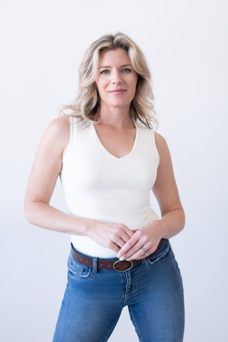Effortlessly stylish and endlessly versatile, the Tracey Top is your wardrobe's new best friend. Its sleeveless cut and flattering V-neckline make it the perfect canvas for statement necklaces or layered looks. Crafted in the USA from wrinkle-resistant, form-flattering fabric, this go-anywhere top keeps you looking polished from morning meetings to evening outings. Prefer a little extra flair? Try the Kelly Top, featuring a playful back keyhole.